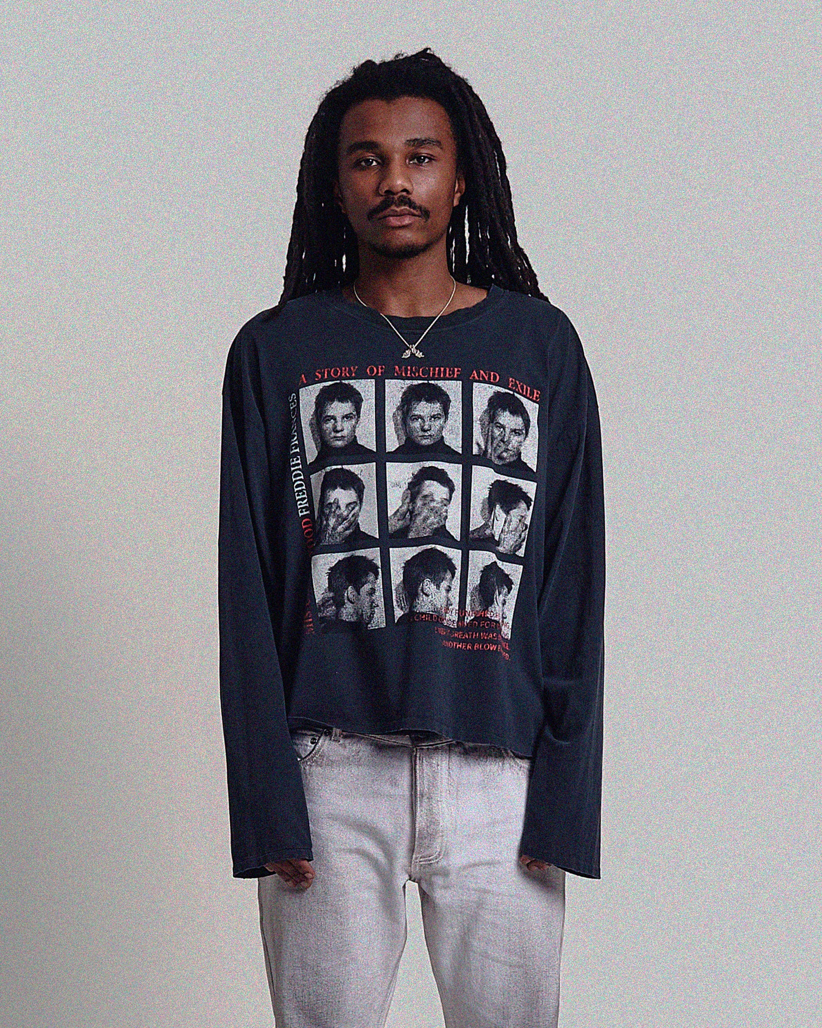 Cotton jersey short-sleeve tee in washed black with intentional distressing and a soft, timeworn finish.