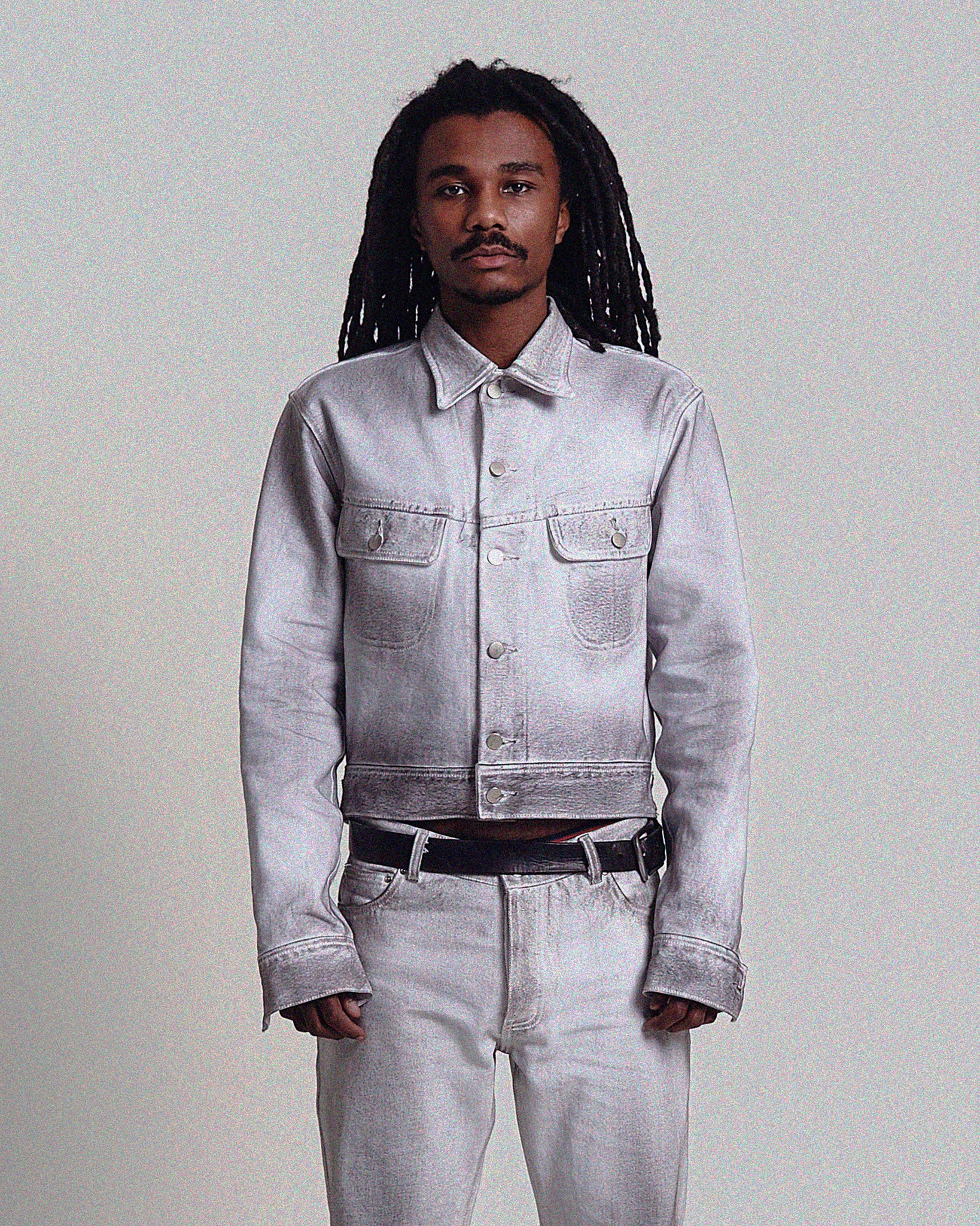 Denim trucker jacket in vintage white with a distressed, intentional dirt wash.