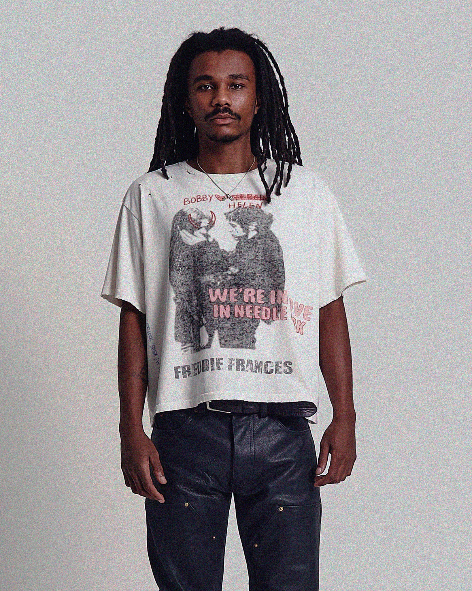 Cotton jersey short-sleeve tee in vintage white with intentional distressing for a worn-in aesthetic.
